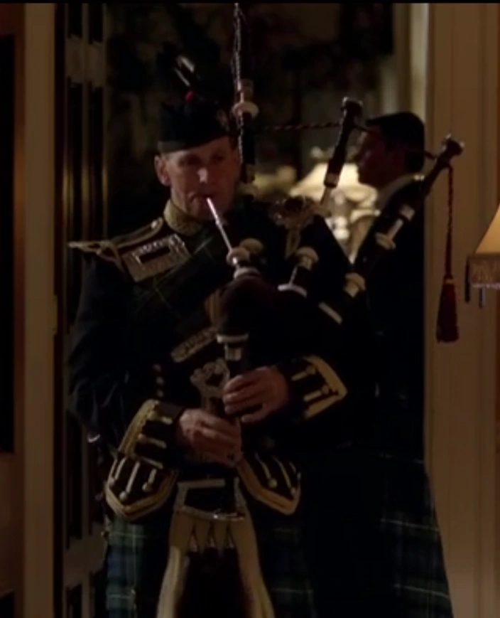 The bagpipe player paraded through the dining room at Duneagle right before the MacClare family and their Crawley relatives began the first dinner of their holiday. Robert Crawley commented that it was marvelous, though only he and a few, including butler McCree thought so. Others, including Matthew Crawley were mildly annoyed.